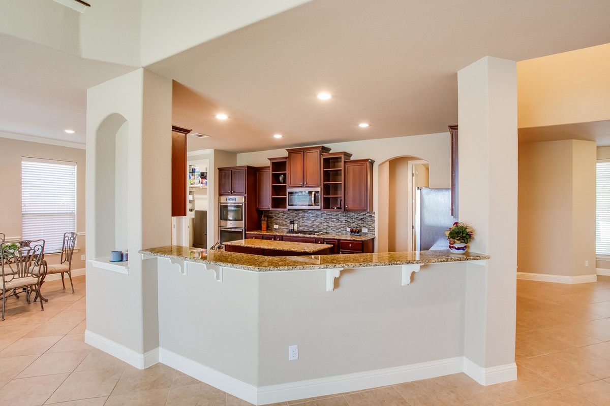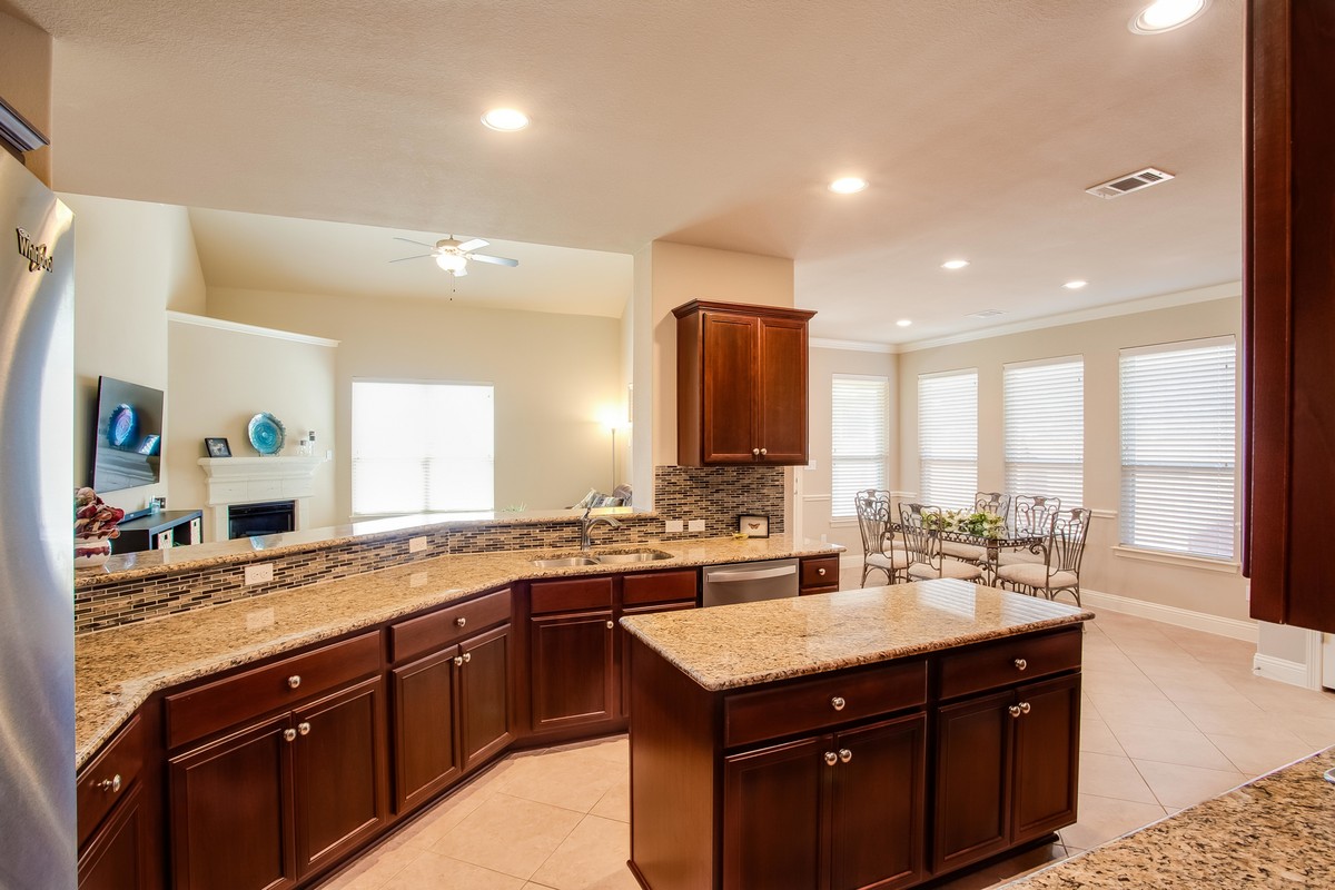 A study/office with wood floors & separate entry from the front patio is located off the main entry. Moving through the entry to the family room, you see the expansive greenbelt just behind the home. The family/great room is wired for surround sound, has an electronic ignition gas fireplace, & is adjacent to the chef's style kitchen making entertaining or family night movie snacks a breeze.