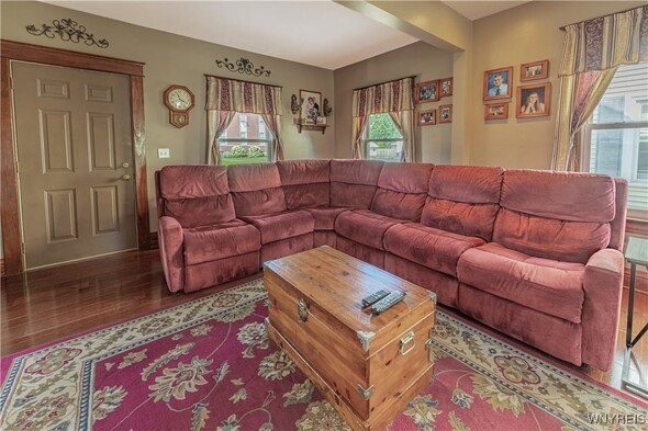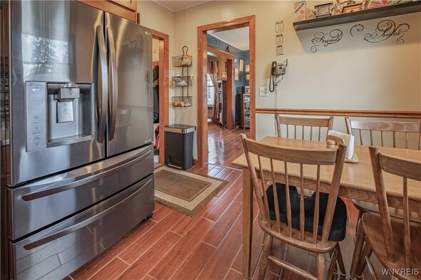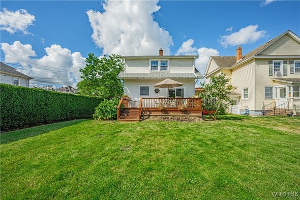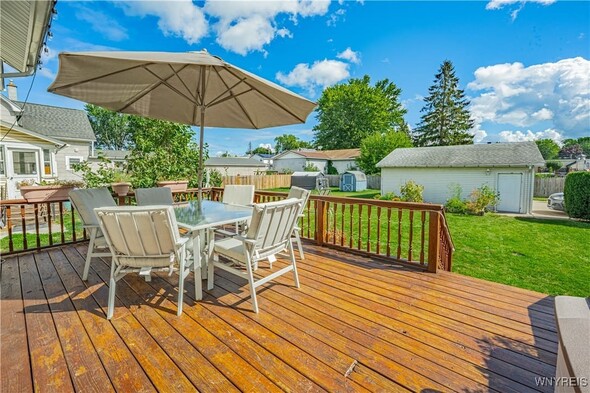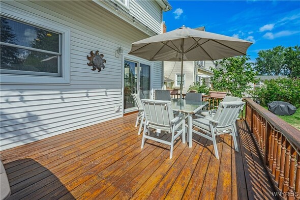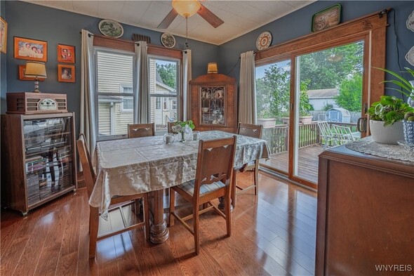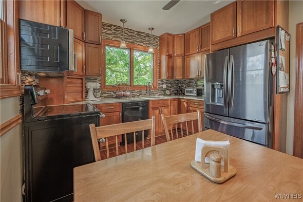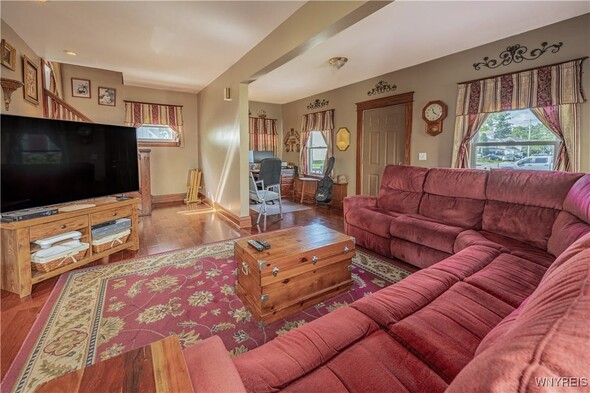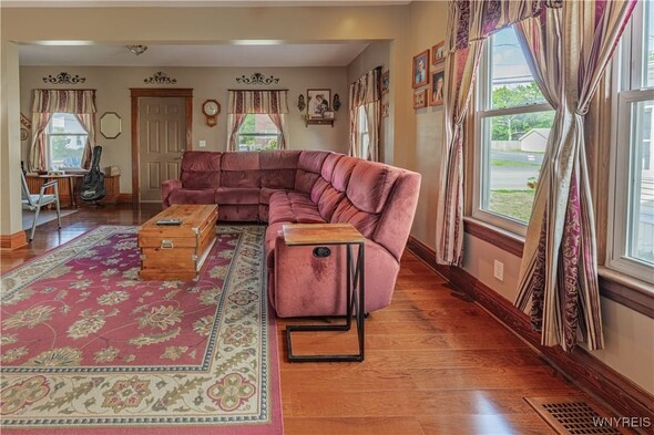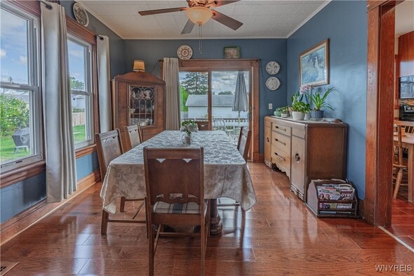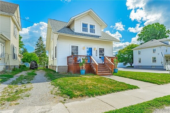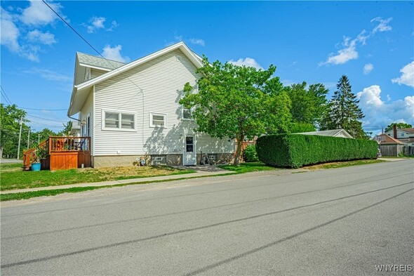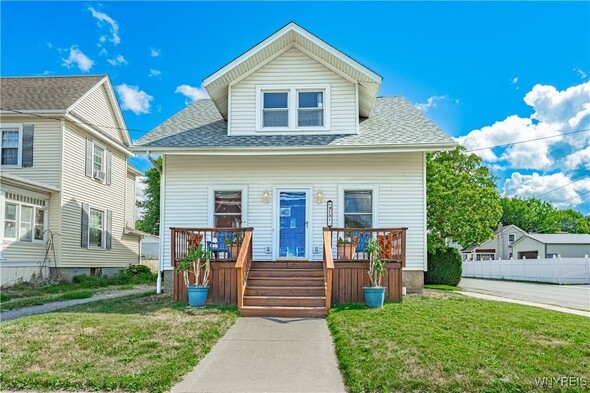 This well-maintained two-story cape style home is located in the heart of Newfane. This home offers 3 bedrooms 1.5 baths and full basement. Gleaming hardwood throughout living room and dining room create an elegant touch while the pristine original woodwork contributes to the home's unique charm and character. Renovated eat in kitchen in with high ceiling, double cabinets, tile floor and backsplash, quartz countertop and appliances including double oven, microwave, stainless refrigerator and dishwasher. Dining room with slider out to spacious deck overlooking the perfect outdoor space for recreation or entertaining. The oversized detached garage provides extra storage space and plenty of room to still park your car. Off street parking for 4 vehicles. Roof was done in 2016. Furnace and Hot Water Heater 2023 and Air Conditioner 2024. Offers will be reviewed on Wednesday 9/3 at 12pm.