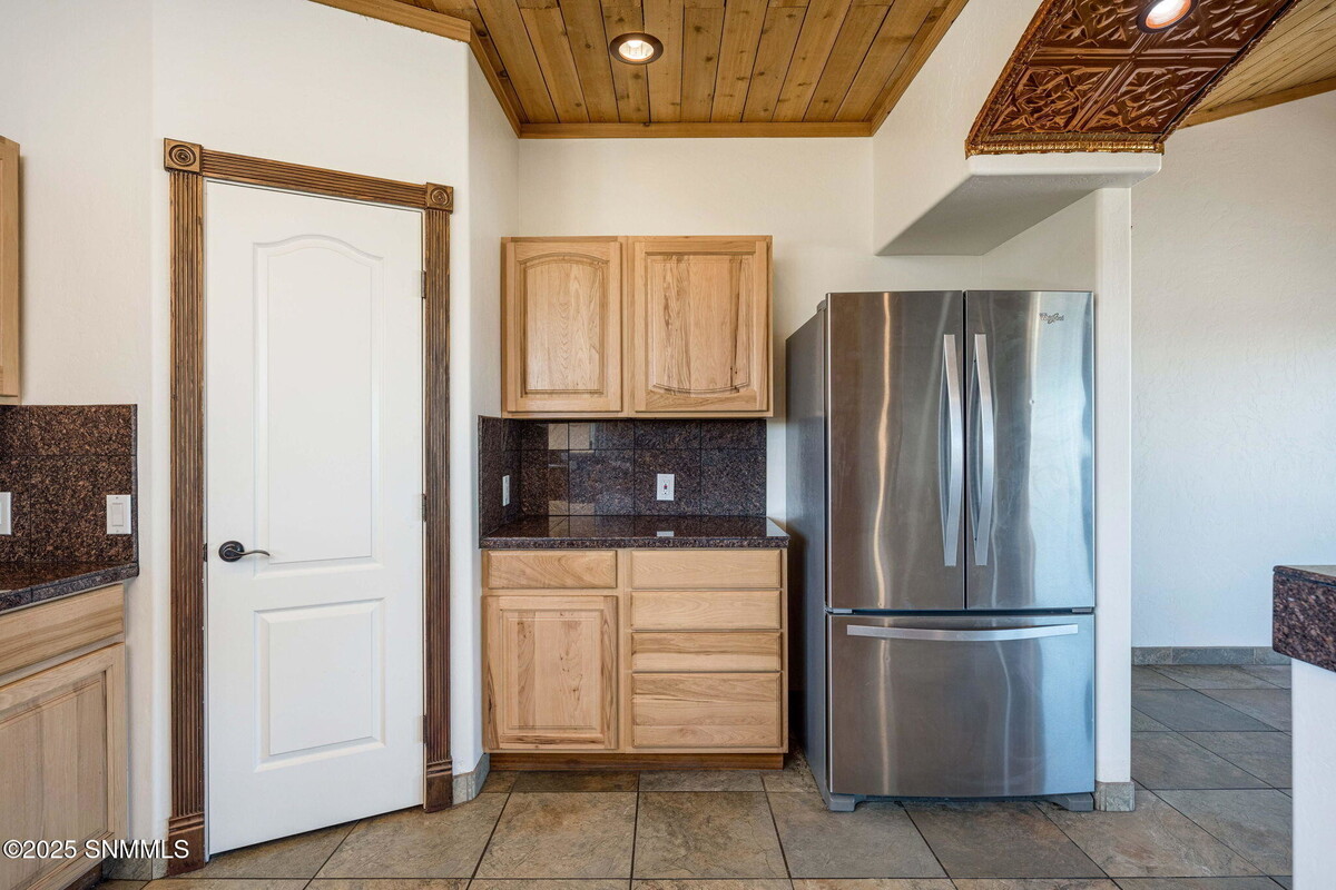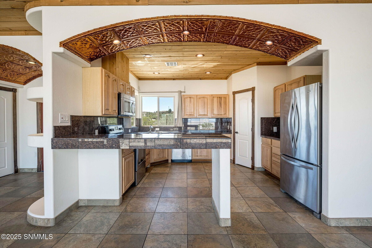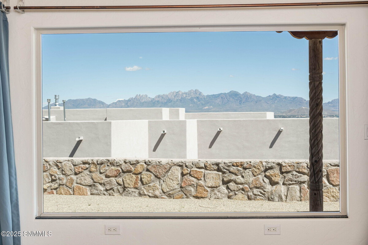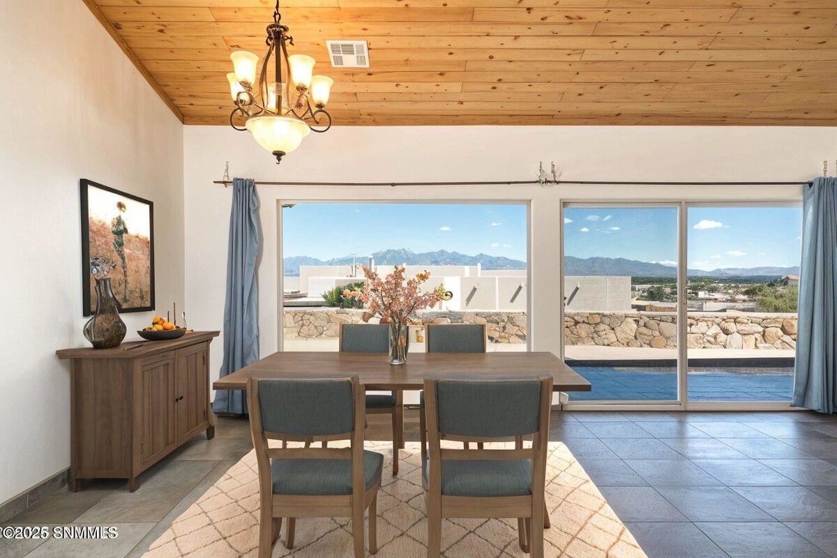 This immaculate Southwest ranch home boasts 3 bedrooms, 2 baths, and 1,805 square feet, set on a spacious 0.84-acre lot. The home radiates Southwest charm, featuring beautiful Talavera tile and distinctive tin and wood ceiling treatments. Upon entering, you'll be captivated by stunning mountain and valley views. The expansive great room features tile floors, a sliding glass door that opens to the back patio, and a generous dining area illuminated by an elegant chandelier. The kitchen is equipped with stainless steel appliances, a breakfast bar, and a pantry. The primary suite enjoys breathtaking views of the mountains and valley, while the ensuite bath showcases a remarkable shower adorned with vibrant Talavera tile and double Talavera sinks. The split floor plan includes two guest bedrooms, each with sliding glass doors to the backyard and scenic views. The stylish guest bath features a large walk-in shower with Talavera tile. The spacious east-facing patio is perfect for relaxing . Some rooms staged.