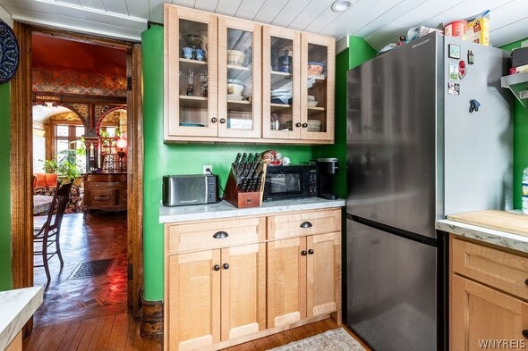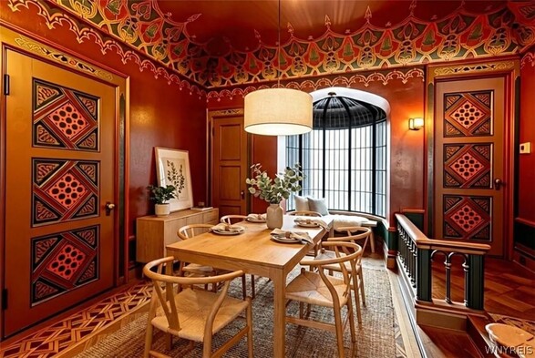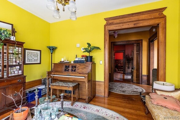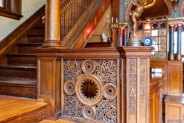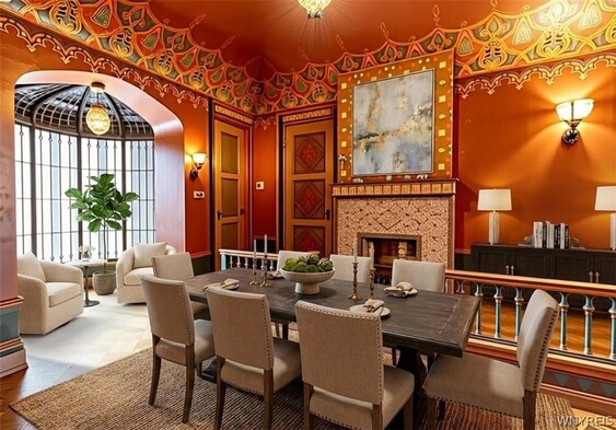 Stunning Historic Buffalo French Chateau Style Home. The Home was built in 1894 by FH Loverin as a Photography Studio and later Sold to a Portrait Photographer - Howard Beach. This two-story townhome has Moorish Architect Details with original hand painted ceilings and walls. Ornate oak woodwork, hardwood floors throughout recently all refinished, all original light fixtures, many new leaded glass windows, wainscoting, exquisite fireplaces, Charming Entryway, first floor features living room, library with built ins and gas fplc, formal din room, kitchen, The second-floor highlights two spacious bedrooms, and a 13 X 6 Bonus Room, full bath and Laundry. Private Outdoor space. Townhouse side rentable for added income. Townhouse features living room, second living room, dining room, kitchen , bath and grand staircase to additional bedrooms. Updated boilers for both - 1 in 2024 & 1 5 years ago, updated electrical systems, roof restored, new drain tile & sump pumps in basement, New windows have been installed in attic 2/2026. Additional details listed on an MLS Attachment with work Completed (over $175,000 plus $31,000 still do be done - work listed that Seller has contracted prior to Closing by Buffalo Best invoice is attached. Also listed as a single family B1659233 and as commercial B1664052.