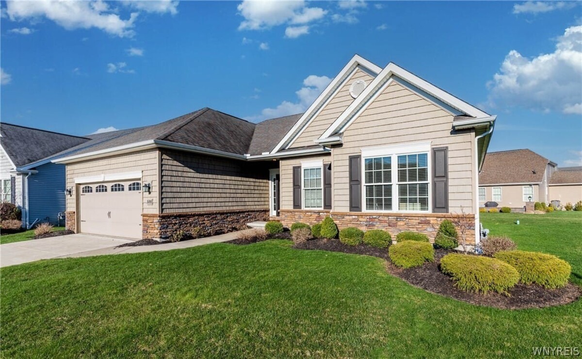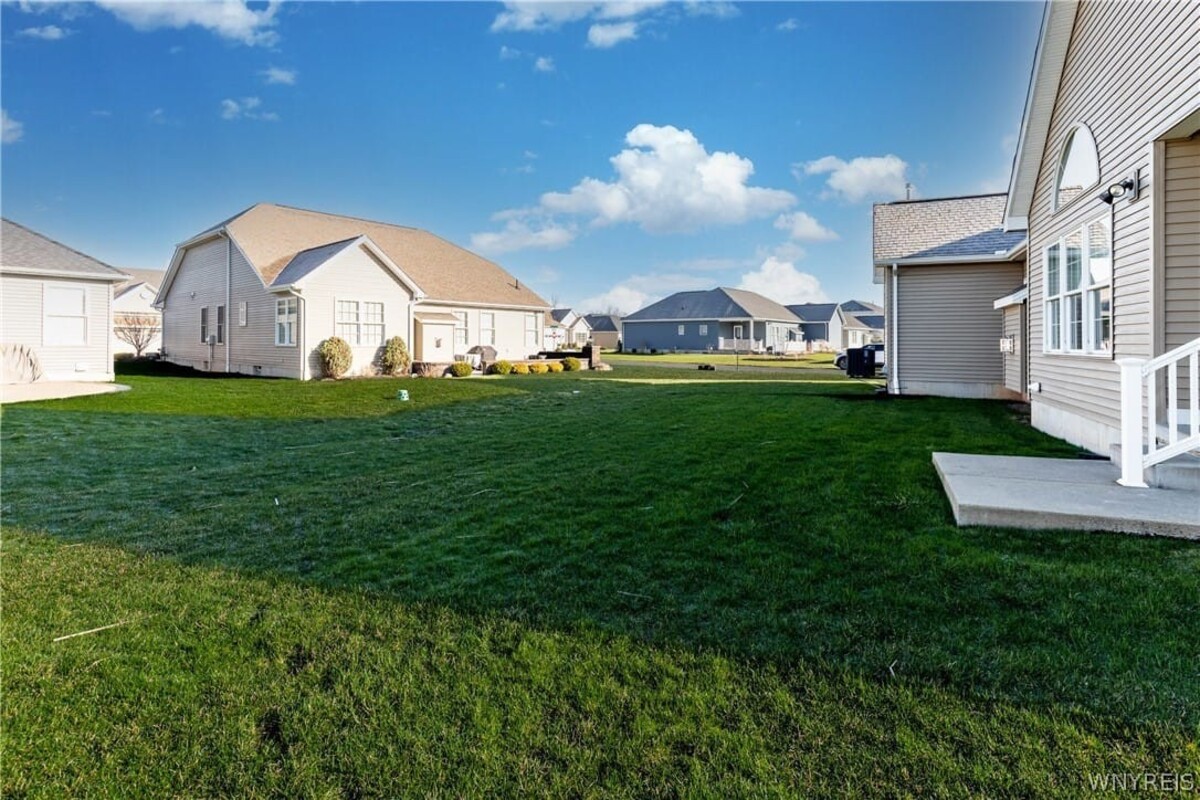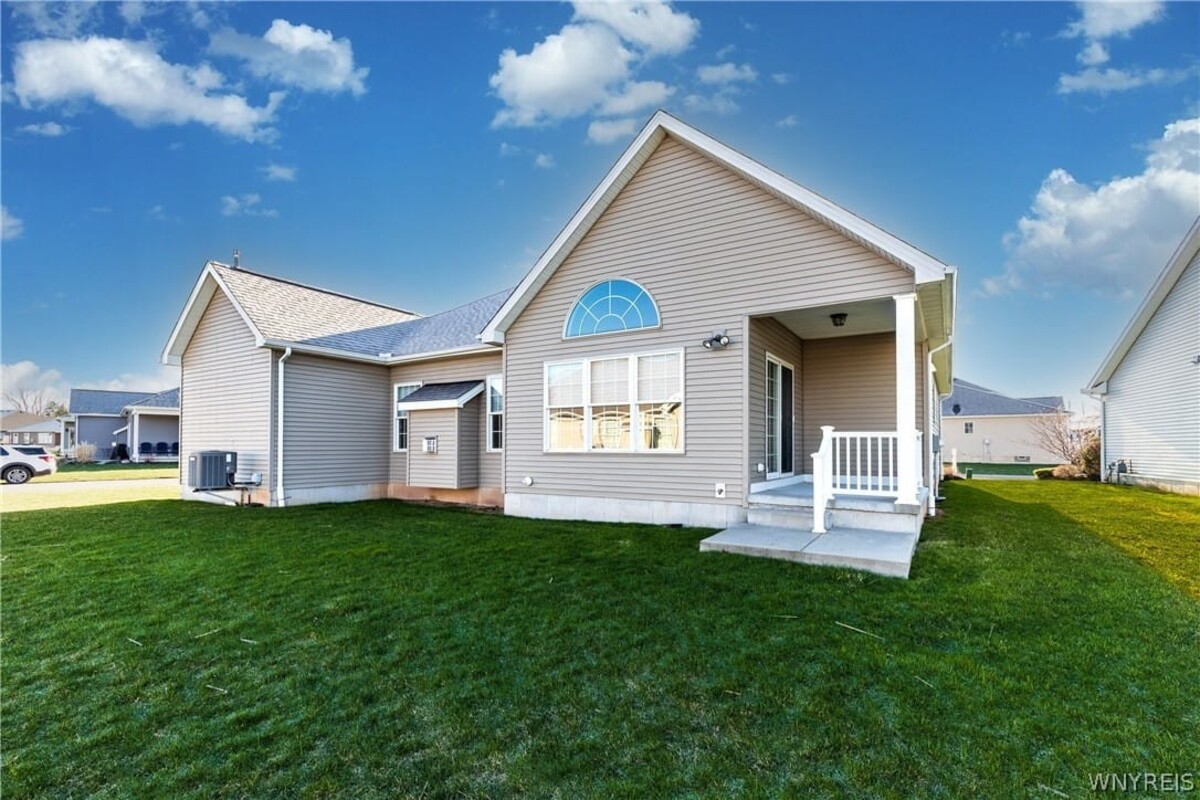 Welcome to this exceptional single-family patio home located in the highly desirable Essex Greens at Waterford subdivision in the heart of Clarence. This beautifully designed residence features 2 spacious bedrooms, 2 full bathrooms, and a versatile private library that can easily serve as a third bedroom or home office. The open-concept floor plan is enhanced by soaring vaulted ceilings, creating a bright and airy living space perfect for both relaxing and entertaining. The stunning white kitchen is equipped with stainless steel appliances, granite countertops, and ample cabinetry, seamlessly flowing into the main living area. Elegant hardwood floors add warmth and sophistication throughout the home. Step outside to enjoy your private backyard oasis, complete with a charming patio and a full sprinkler system to maintain the lush surroundings with ease. The lower level offers impressive 8-foot ceilings, providing excellent potential for additional living space, storage, or future finishing. This home combines comfort, style, and convenience in one of Clarences most sought-after communitiesan incredible opportunity you wont want to miss!