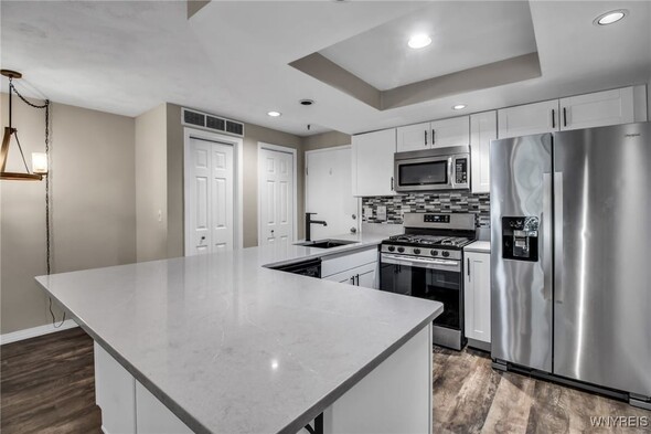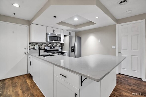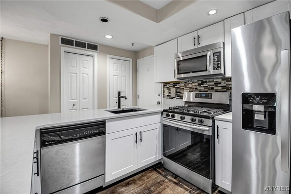 Welcome home! Step into this beautifully updated 2-bedroom, 1-bath condo designed for easy living. The bright white kitchen shines with quartz countertops, a breakfast bar, stainless steel appliances (refrigerator 7/21), and durable vinyl plank flooring. Enjoy the open-concept layout with a cozy dining area and spacious living room featuring a marble-surround gas fireplace, sleek flooring, and a sliding glass door (6/23) that opens to a charming porchideal for morning coffee or evening relaxation. The second bedroom offers its own sliding glass door (6/23) leading to the upper porch, while the primary bedroom includes a step-in closet with organizers, vinyl window (6/23), and pocket door access to a spa-inspired full bath with marble tile flooring and an upgraded vanity (6/21). Convenience abounds with in-unit laundry featuring built-in shelving and washer/dryer (4/24). Major mechanicals updatedfurnace & A/C (9/19) and water heater (10/19). Ample open parking, pet-friendly (cats allowed) Nothing left to do but unpack, settle in, and start enjoying the lifestyle you desire.