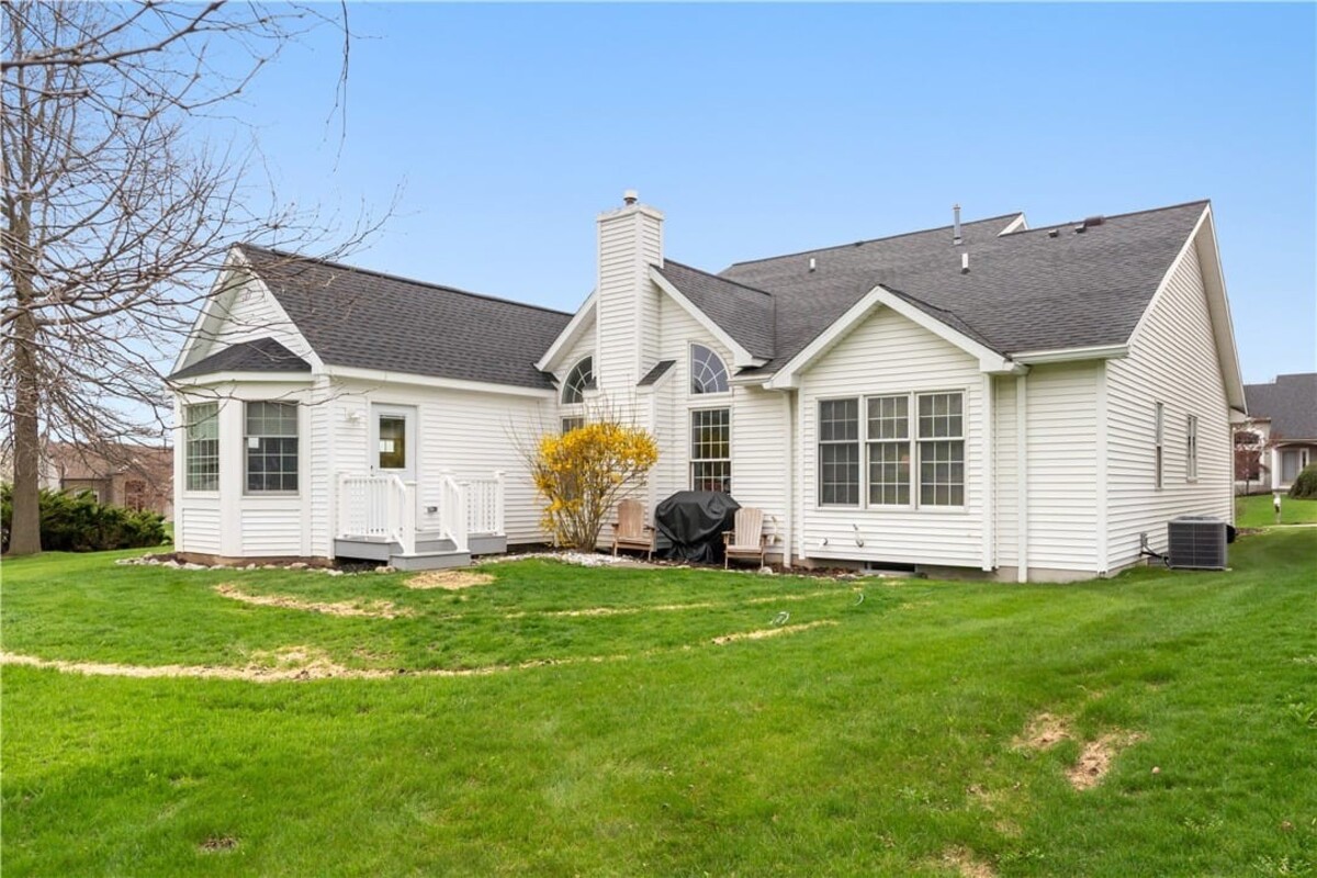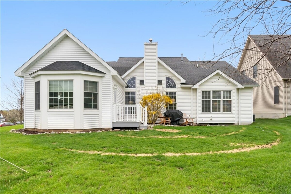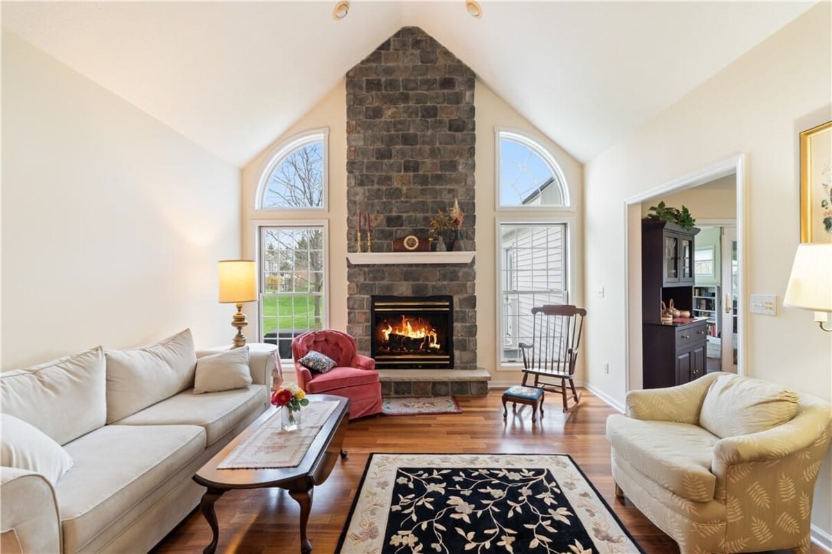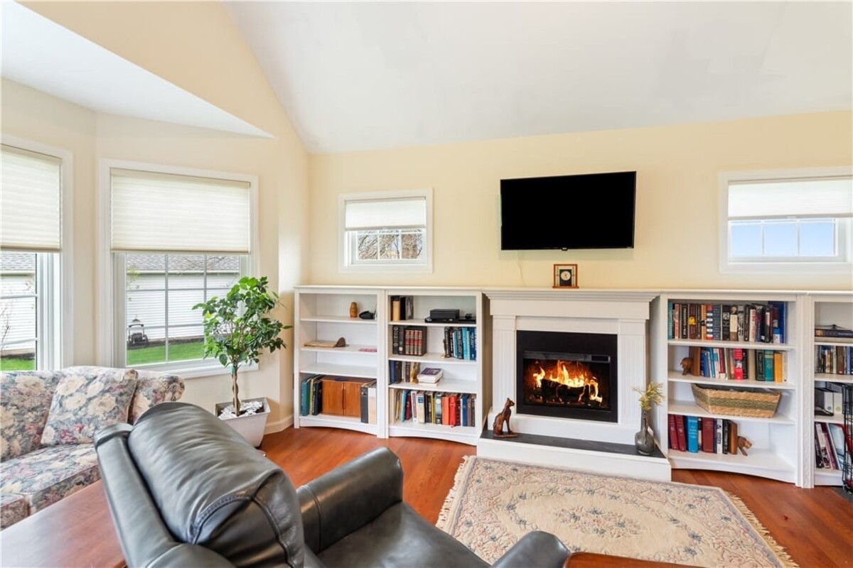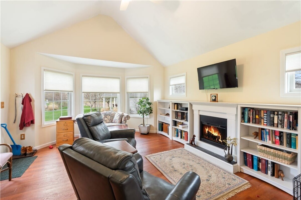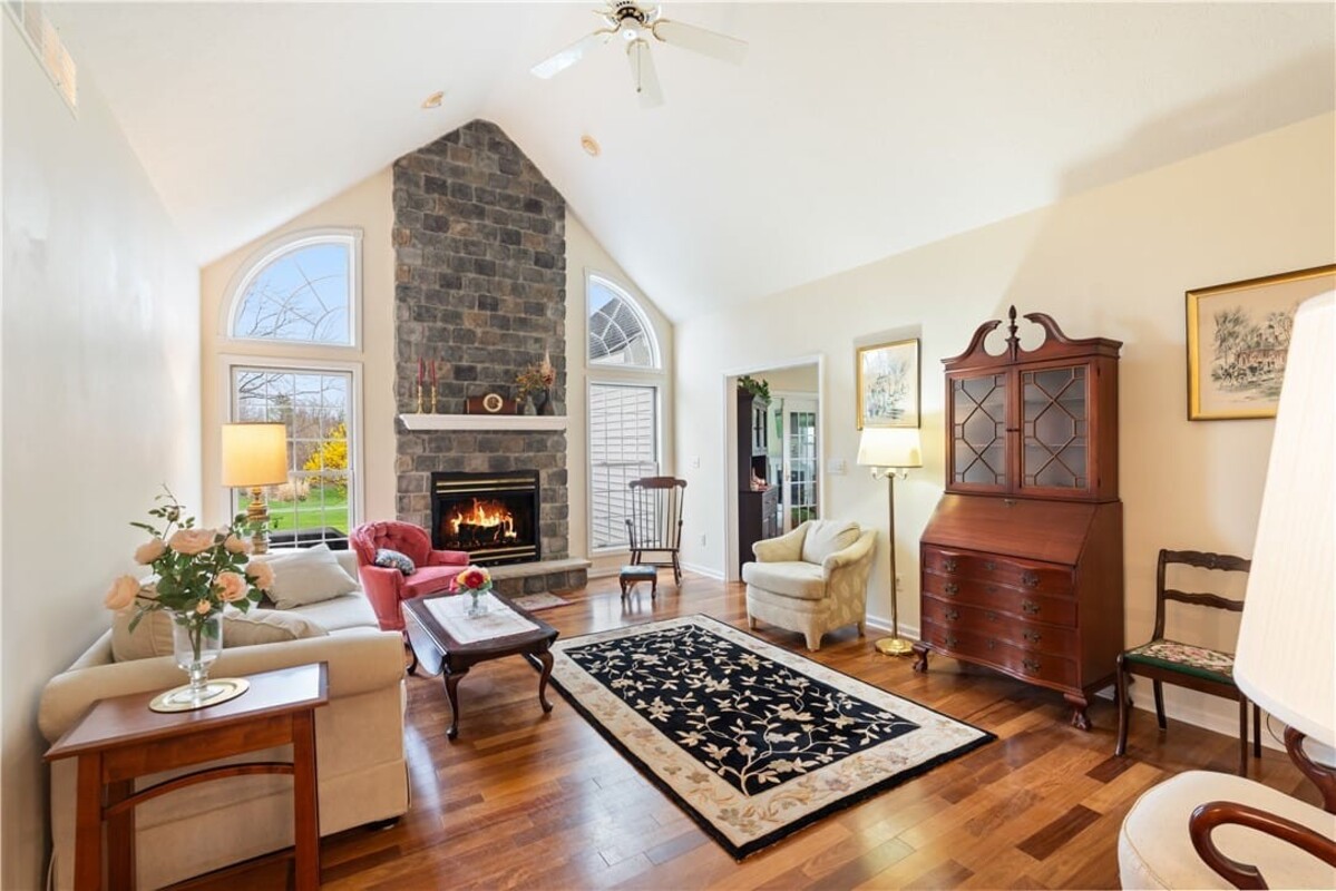 Welcome to this inviting 3 bedroom, 3 full bath beautiful home. Enjoy first floor living with extra bedroom and bathroom on second floor for guests. Beautiful bright livingroom, pop out windows in kitchen/sitting area where you can enjoy a cup of morning coffee and enjoy the view. Beautiful new 4 season room off the kitchen with gas fireplace (additional 260 sq. feet). The formal living room features a cozy fireplace that flows into a spacious dining room and kitchen perfect for holiday gatherings. Vaulted ceilings and ample windows bring in the natural light. Stunning teak hardwood floors. On demand hotwater tank. Kitchen offers spacious counterspae for cooking and baking. Primary bedroom offers its own full bathroom on the first floor. Enoy the space of a 2 story home with all you need on one floor. The 2 car garage gives you not only space for 2 cars but added room for storage and direct access into the home. HOA covers mowing and treating of common grounds, maintain the ponds.