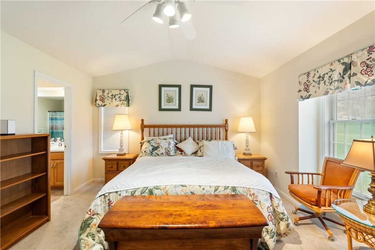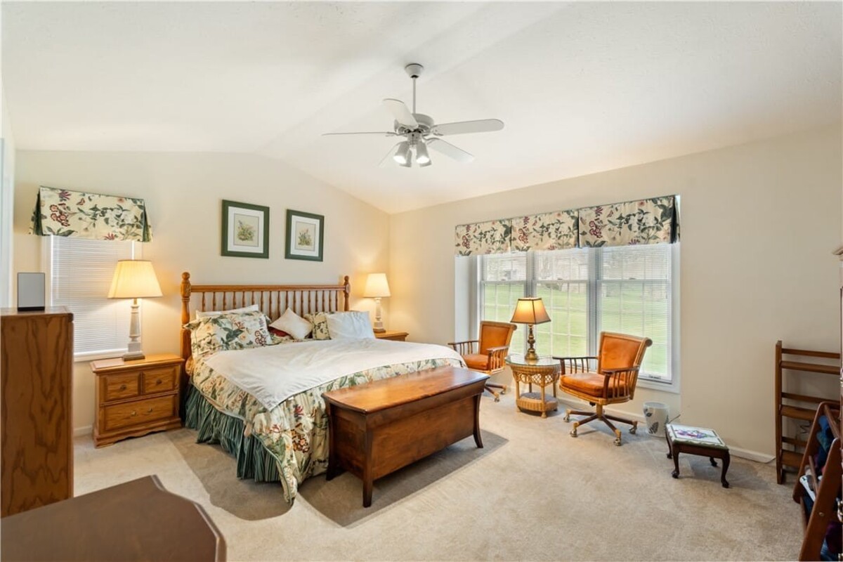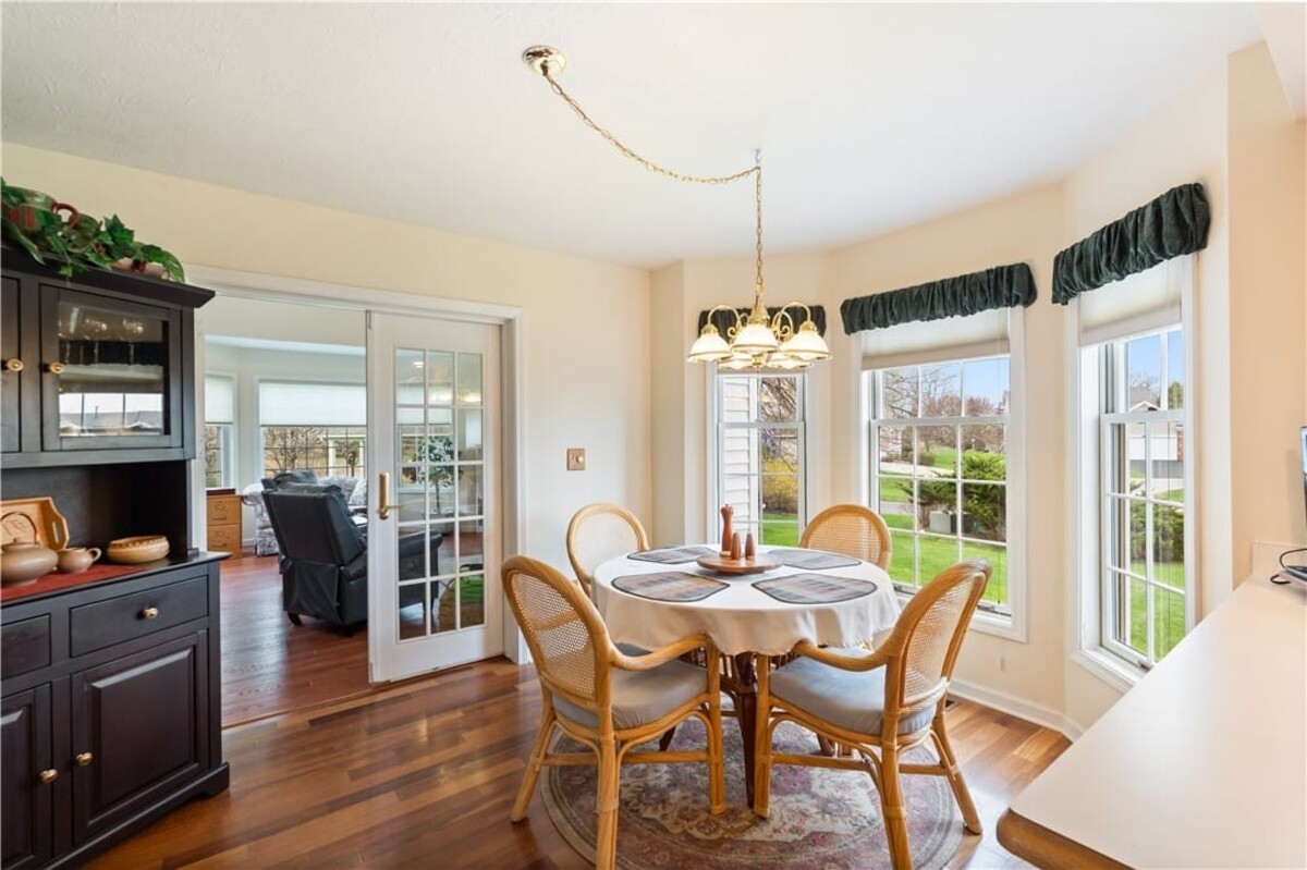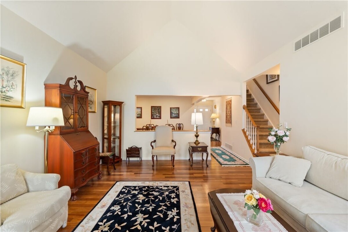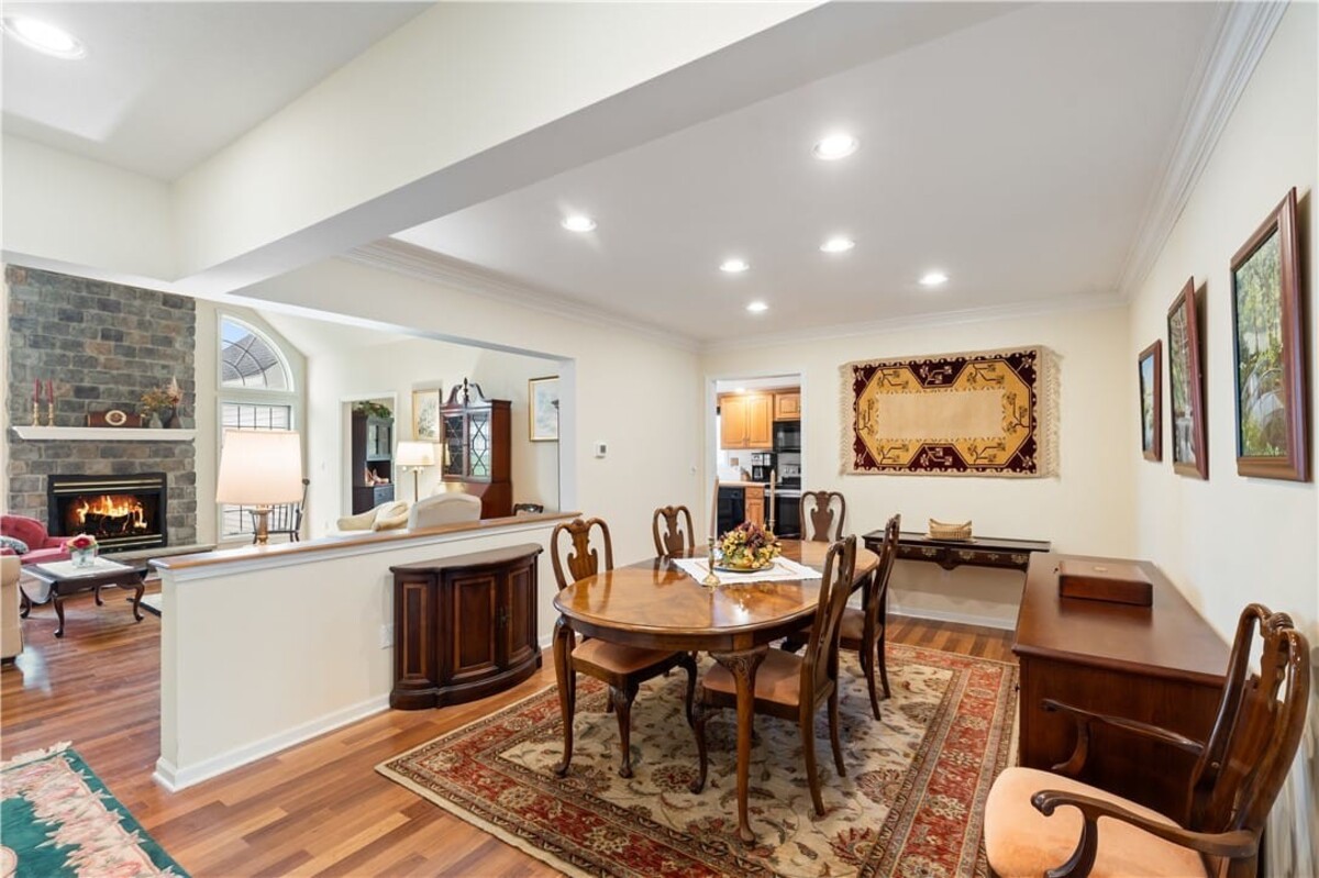 Welcome to this inviting 3 bedroom, 3 full bath beautiful home. Enjoy first floor living with extra bedroom and bathroom on second floor for guests. Beautiful bright livingroom, pop out windows in kitchen/sitting area where you can enjoy a cup of morning coffee and enjoy the view. Beautiful new 4 season room off the kitchen with gas fireplace (additional 260 sq. feet). The formal living room features a cozy fireplace that flows into a spacious dining room and kitchen perfect for holiday gatherings. Vaulted ceilings and ample windows bring in the natural light. Stunning teak hardwood floors. On demand hotwater tank. Kitchen offers spacious counterspae for cooking and baking. Primary bedroom offers its own full bathroom on the first floor. Enoy the space of a 2 story home with all you need on one floor. The 2 car garage gives you not only space for 2 cars but added room for storage and direct access into the home. HOA covers mowing and treating of common grounds, maintain the ponds.