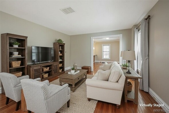 You will feel warm & fuzzy the moment you arrive from the covered front porch to the front entrance with ceramic flooring & the NEW sparkling HDWD flrs throughout the living, dining rooms & 1st fl bedroom (could be craft/workout/play space). The living spaces are bright, open and spacious. The kitchen has a dishwasher, snack bar, pantry, ceramic floor and a rear entrance onto the deck. A full bath w/laundry complete the 1st floor. Upstairs are 4 more bedrooms with new w/w carpet. Fresh neutral paint throughout and did I mention clean! Additional updates include siding, windows, waterline, arch roof & chimney 25', HE furnace, glass blk windows. Just move in and enjoy! Showings begin Saturday 3/21. Offers will be heard as they come.