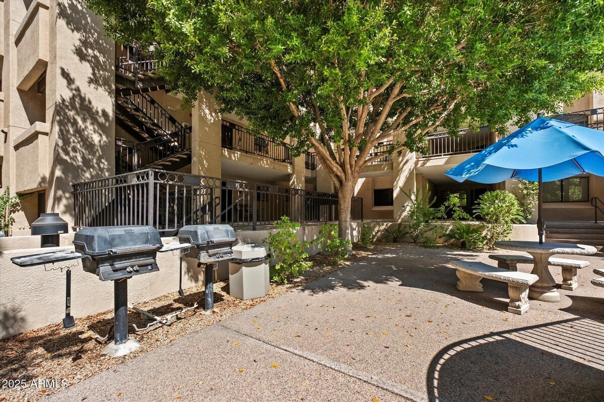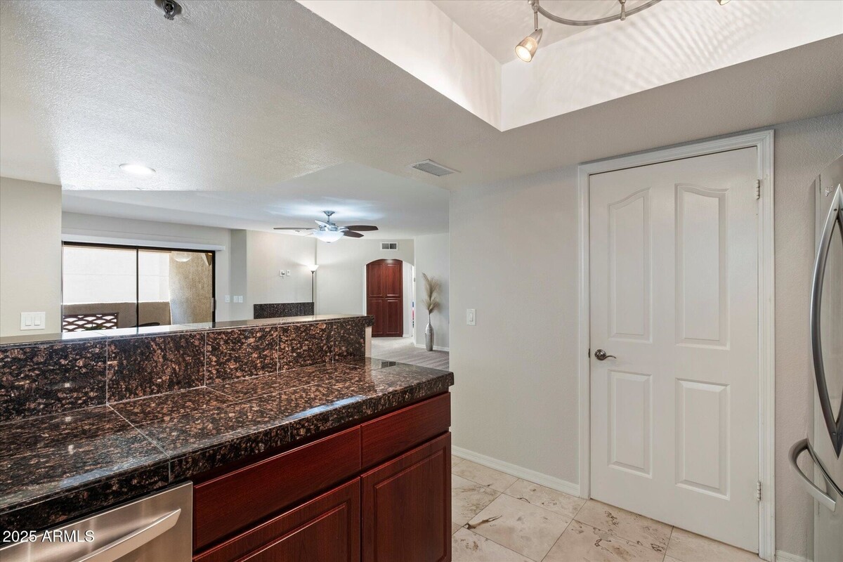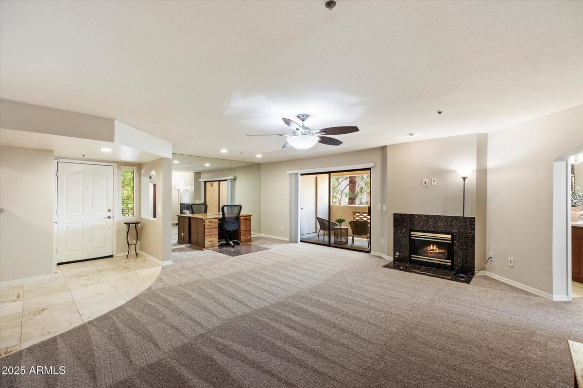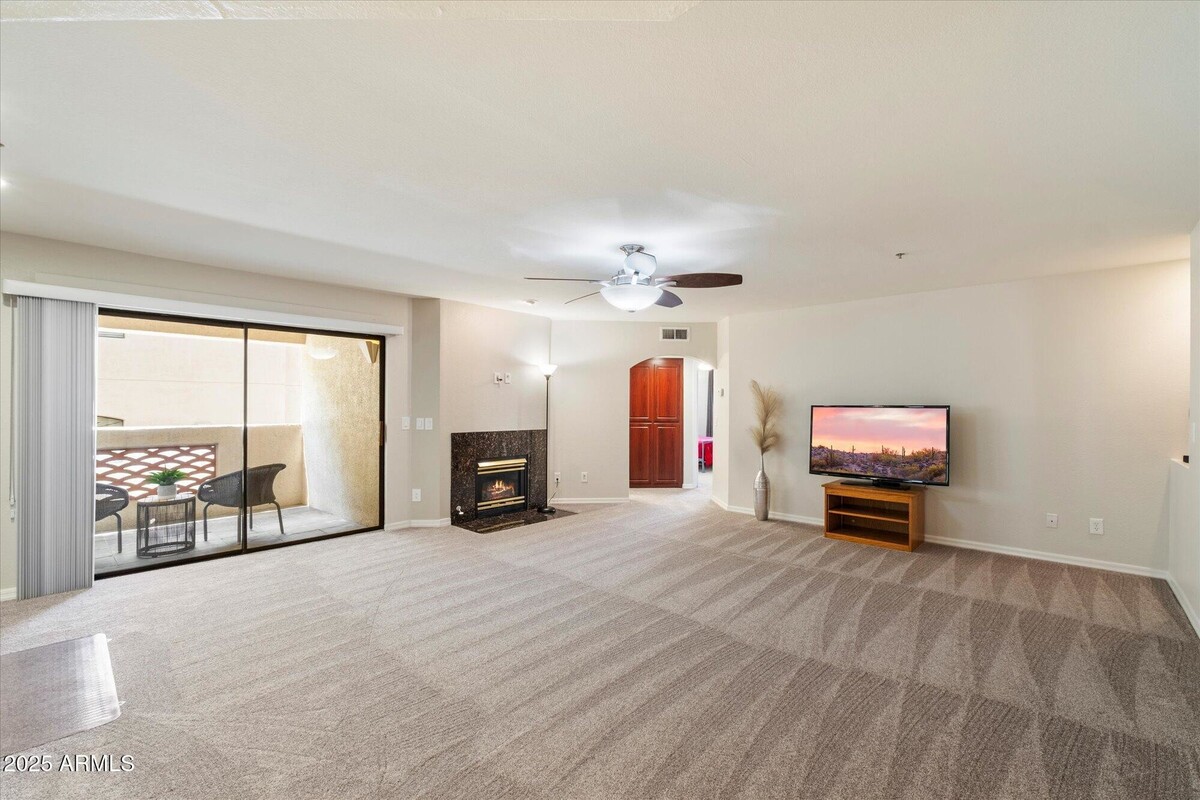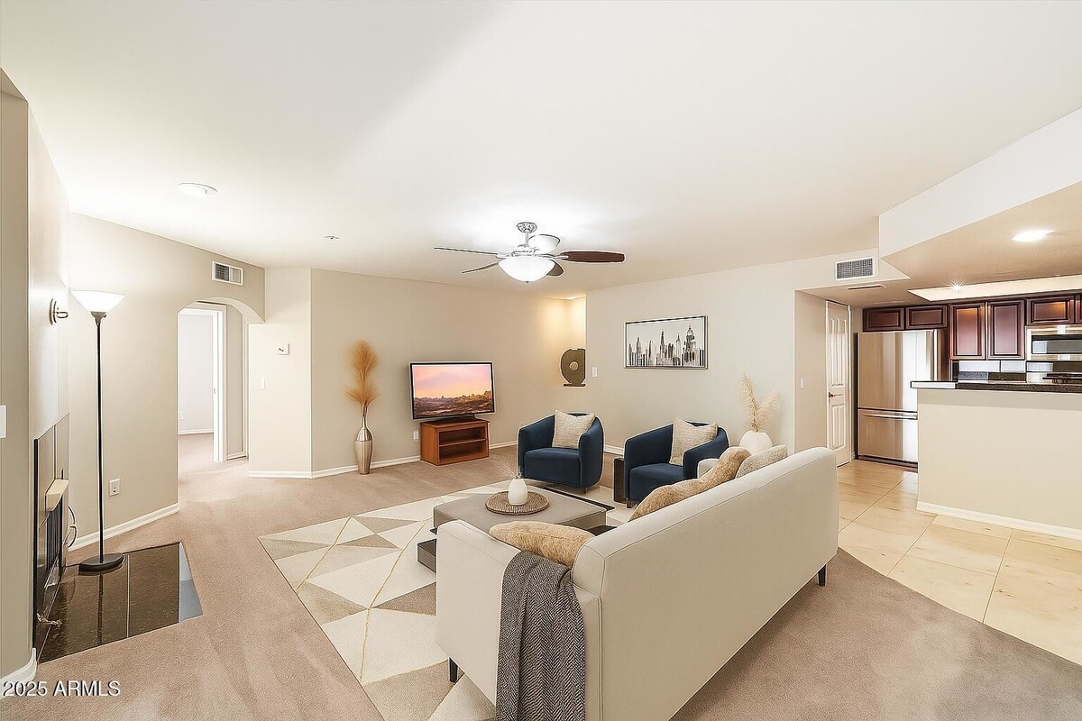 Discover comfort and style in this upgraded 2-bed corner unit filled with natural light in the gated Meridian community. Priced to sell! Just steps from the heated pool/spa, this home features fresh paint, new carpet, updated electrical, and a remodeled bath with quartz counters, walk-in shower, and modern fixtures. The kitchen offers stainless steel appliances and granite tile counters. Enjoy cozy nights by the fireplace or relax on the private slate-tiled patio. Bedrooms offer blackout curtains and ceiling fans. Assigned underground parking is across from the elevator, plus HOA-coveres gas utility. This former model has no west-side neighbors, with direct access to pool, BBQ, gym, mailboxes, and clubhouse. Don't miss your opportunity to capture resort-style living in a prime Phoenix loc Location Highlights: