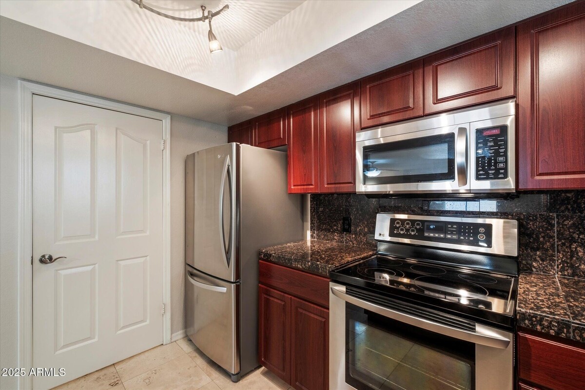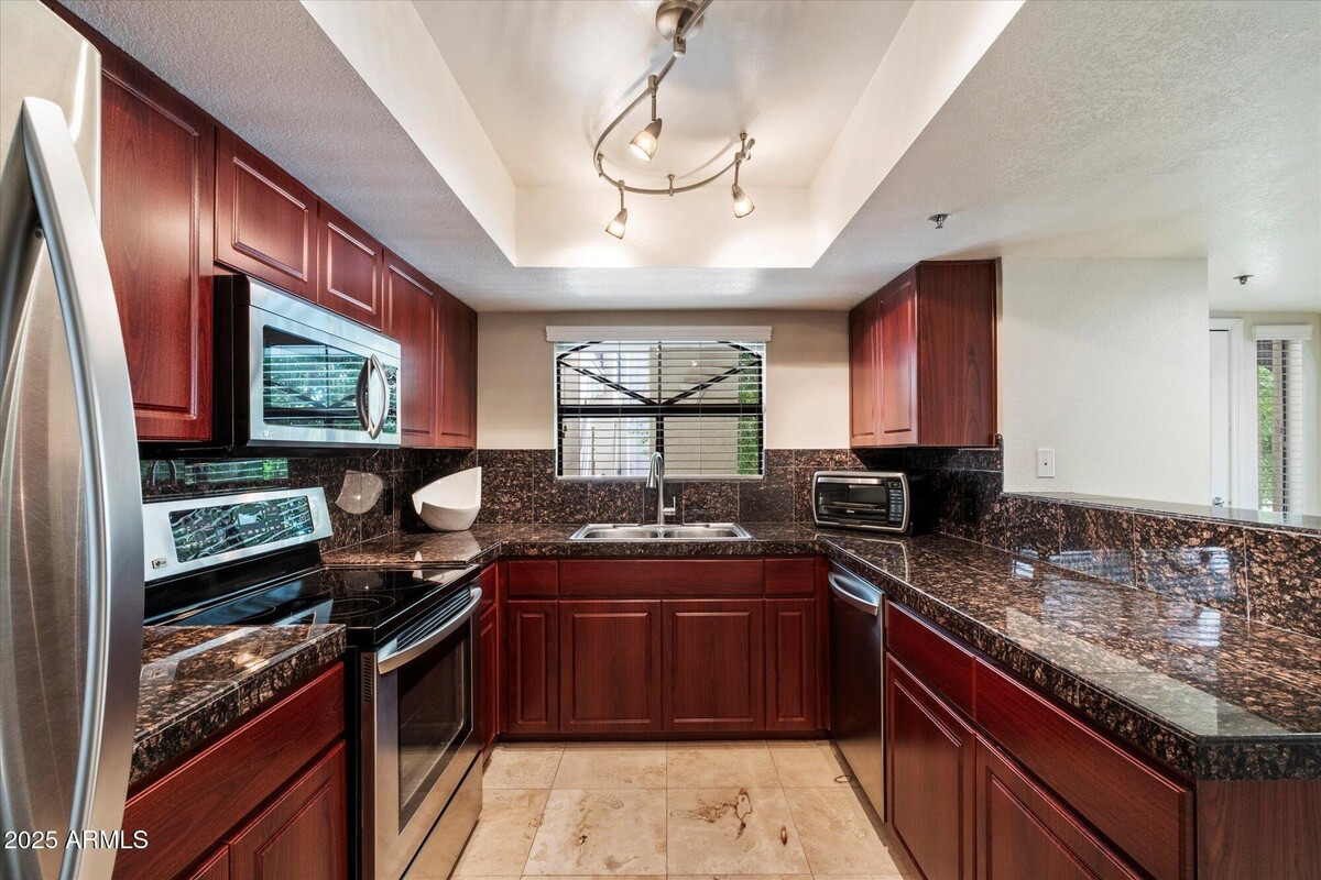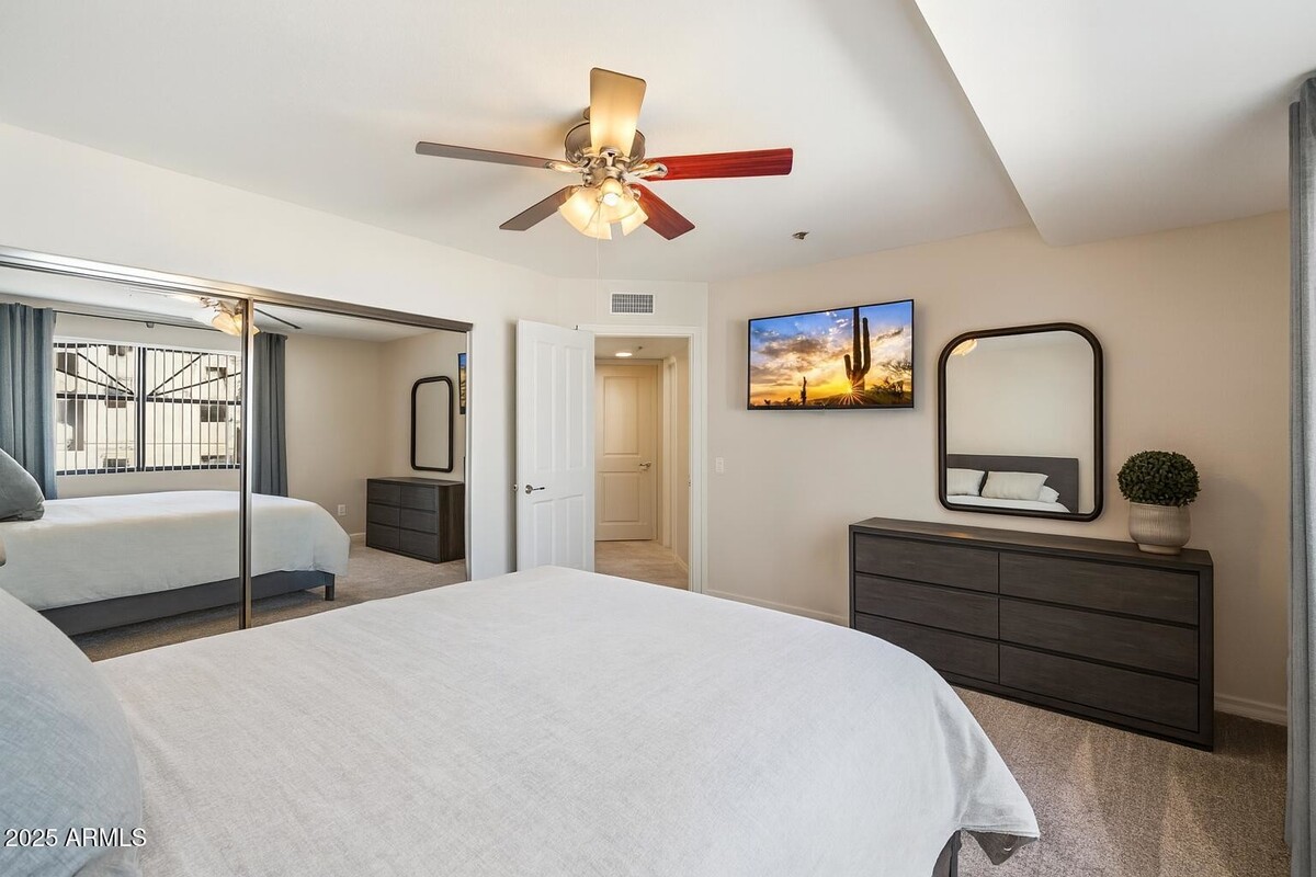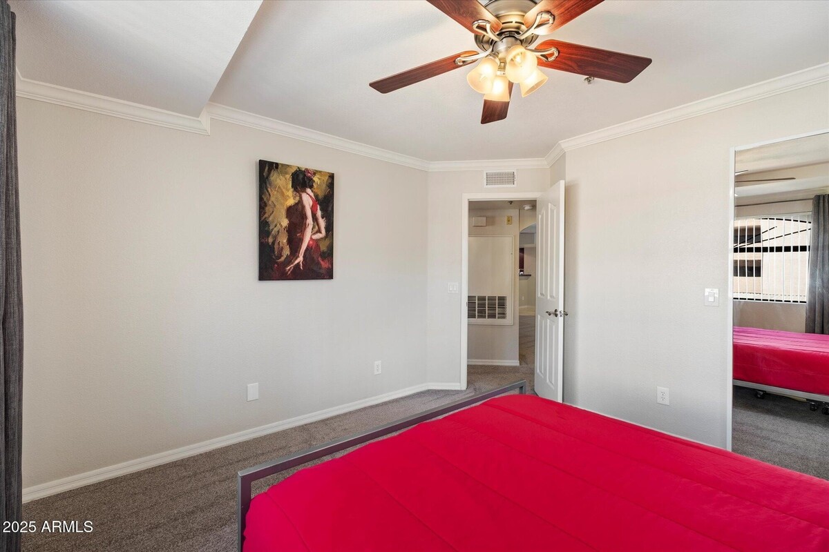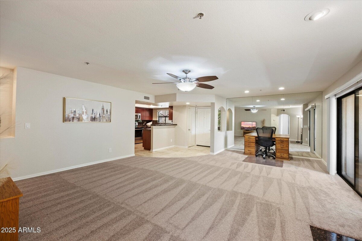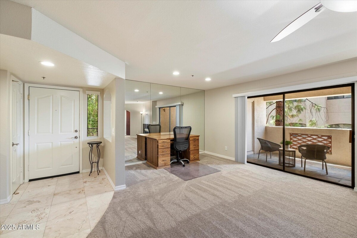 Discover comfort and style in this upgraded 2-bed corner unit filled with natural light in the gated Meridian community. Priced to sell! Just steps from the heated pool/spa, this home features fresh paint, new carpet, updated electrical, and a remodeled bath with quartz counters, walk-in shower, and modern fixtures. The kitchen offers stainless steel appliances and granite tile counters. Enjoy cozy nights by the fireplace or relax on the private slate-tiled patio. Bedrooms offer blackout curtains and ceiling fans. Assigned underground parking is across from the elevator, plus HOA-coveres gas utility. This former model has no west-side neighbors, with direct access to pool, BBQ, gym, mailboxes, and clubhouse. Don't miss your opportunity to capture resort-style living in a prime Phoenix loc Location Highlights: