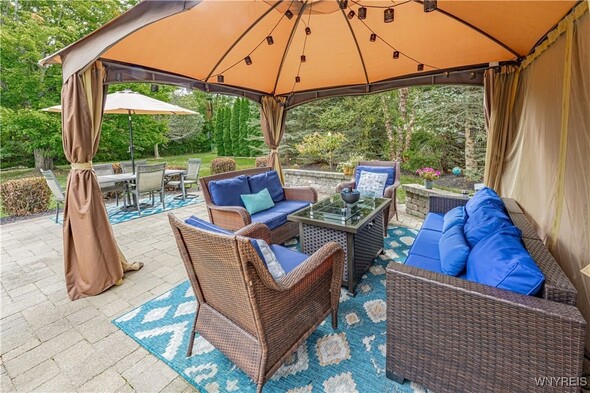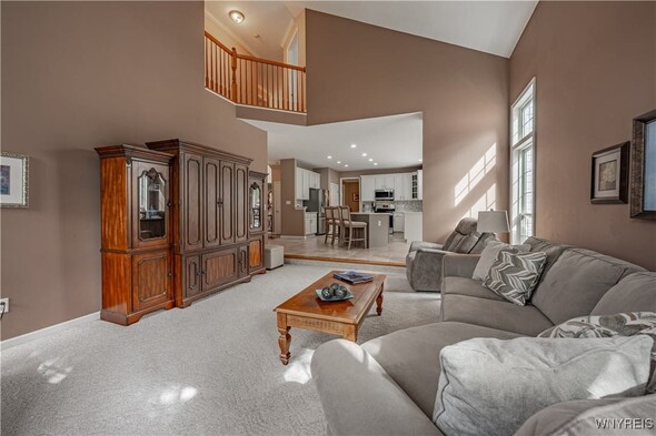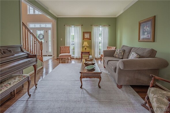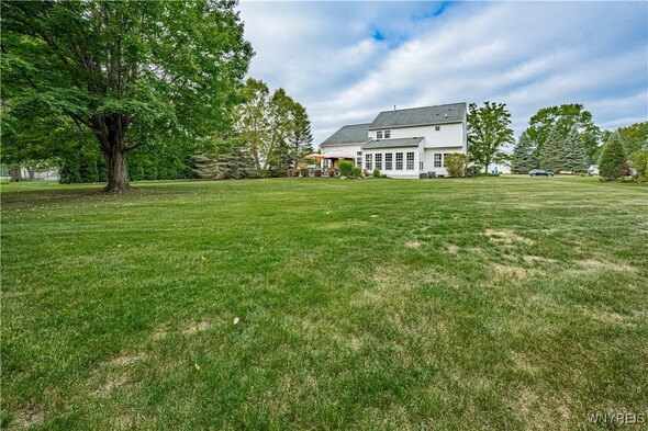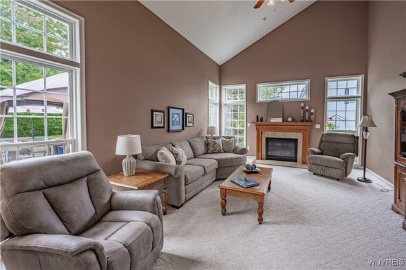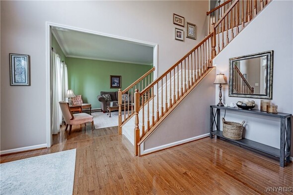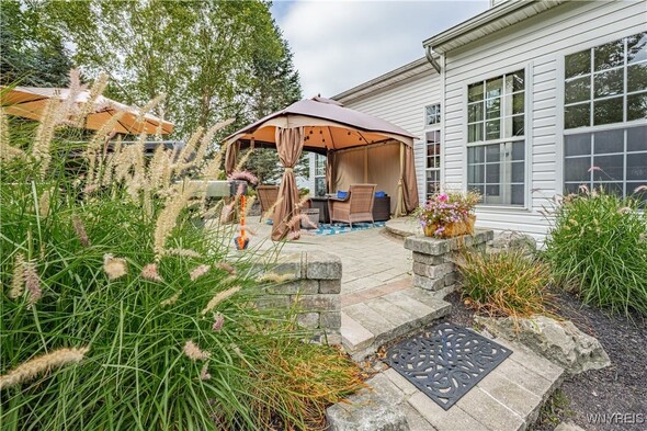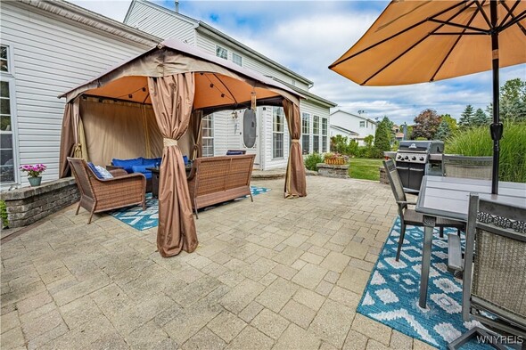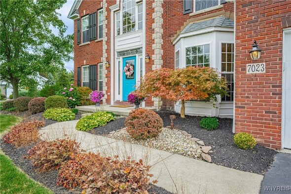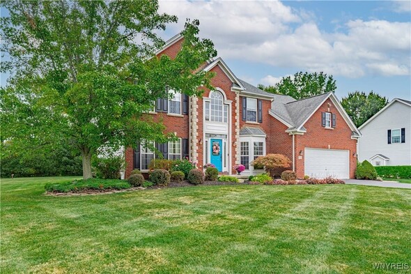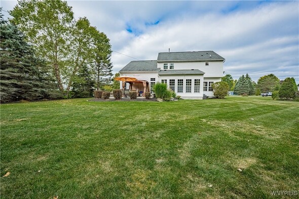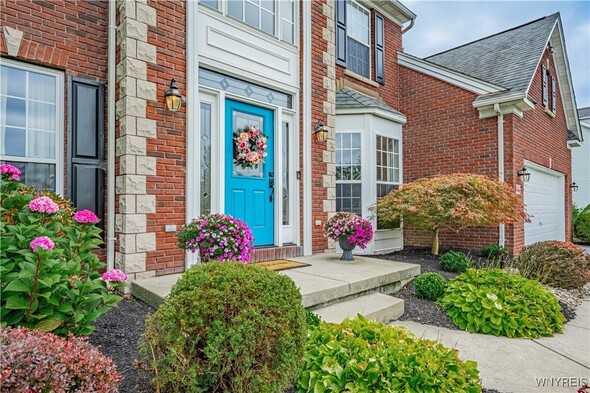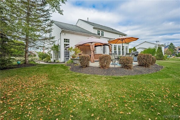 Pristine and well-appointed. Custom-built 4-bedroom, 2.5-bathroom home located in the established Arrowhead Estates, Pendleton. Starpoint Schools. This exceptional property offers a tranquil living experience, situated on a cul-de-sac/dead-end street. The grand two-story foyer leads to a modern eat-in kitchen featuring quartz counters, a detailed backsplash, an oversized island, and a breakfast bar. Enjoy the bright and inviting morning room with a vaulted ceiling. The great room boasts transom windows, a gas fireplace, and a Juliet balcony overlook. A first-floor laundry room with a utility sink, Living room, and a dining room with crown molding and hardwood floors complete the main level. French doors open to a private den, perfect for a home office. The second floor offers four large bedrooms, including a primary bedroom with a newly updated bathroom (2025) featuring heat lamps. The second bathroom also includes double sinks and a heat lamp. This backyard is an entertainer's dream with no rear neighbors. Tasteful landscaping that enhances the homes beauty and curb appeal. It boasts a private Unilock stone patio with side walls, and a vinyl gazebo placed over the patio conveys with the property. The roof was replaced in 2014, the A/C unit 2007, and the hot water tank is approximately five years old. The home also features an upgraded air purification system and a newer updated front door with sidelights and a transom window. All furnishings are available for sale. No escalation clauses please.